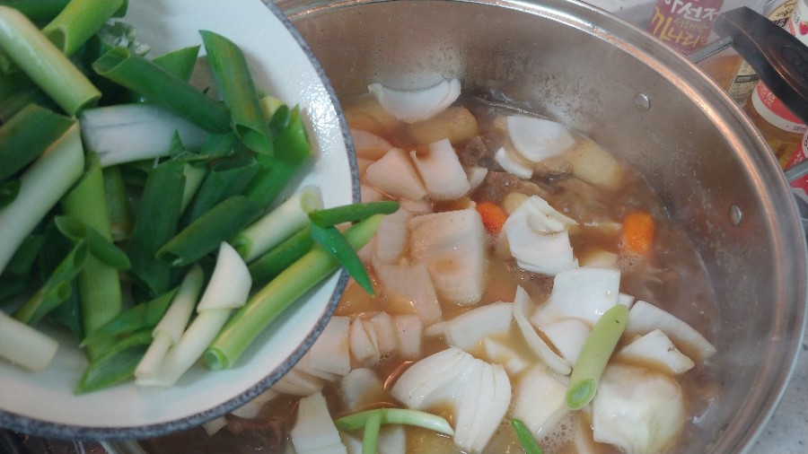 다시 끓어오르기 시작하면 양파와 파를 넣어줘요~