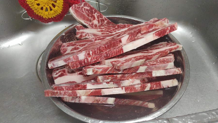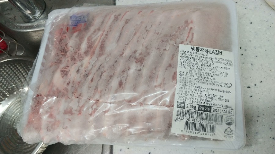우선 냉동실에 있던 LA갈비를 물에 담궈 핏물을 빼줍니다.