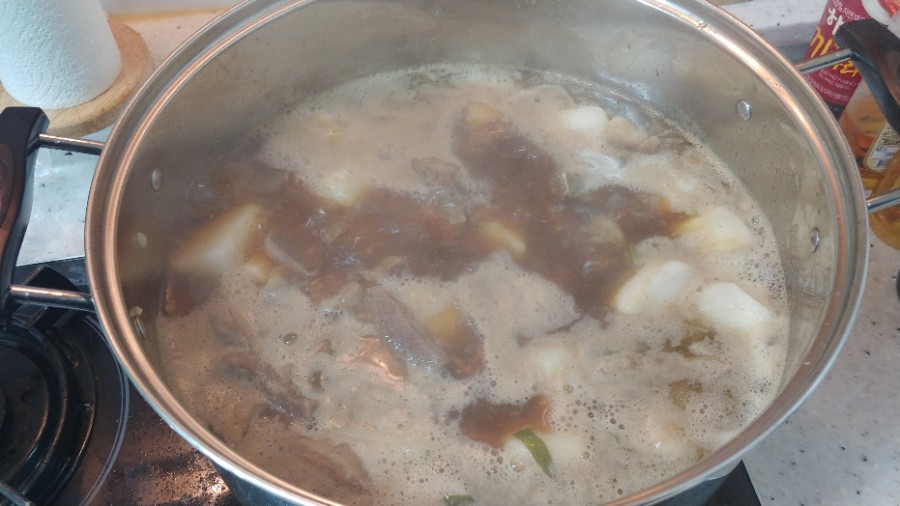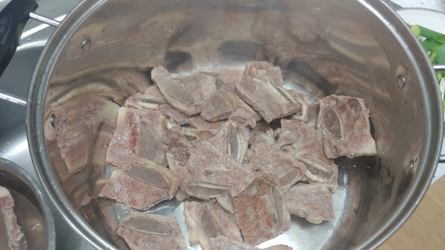 물이 끓을 때 핏물 뺀 갈비들을 넣고 데쳐 줍니다.